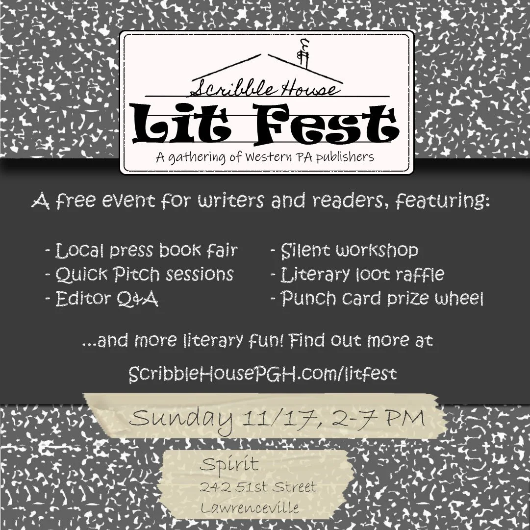 The Scribble House Lit Fest is a celebration of Western PA publishers. The core event is a book fair where readers and writers can connect with journals and small presses that call the Pittsburgh area home. Other activities will include a Q&A session with editors, an asynchronous silent workshop, a raffle, and the option for writers to sign up for a slot to pitch their work to a press or journal. The event is free and open to the public but attendees get a free raffle ticket if they pre-register (all attendees can buy raffle tickets the day of the event, too). You can register or see more details about the schedule and activities at https://www.scribblehousepgh.com/litfest/