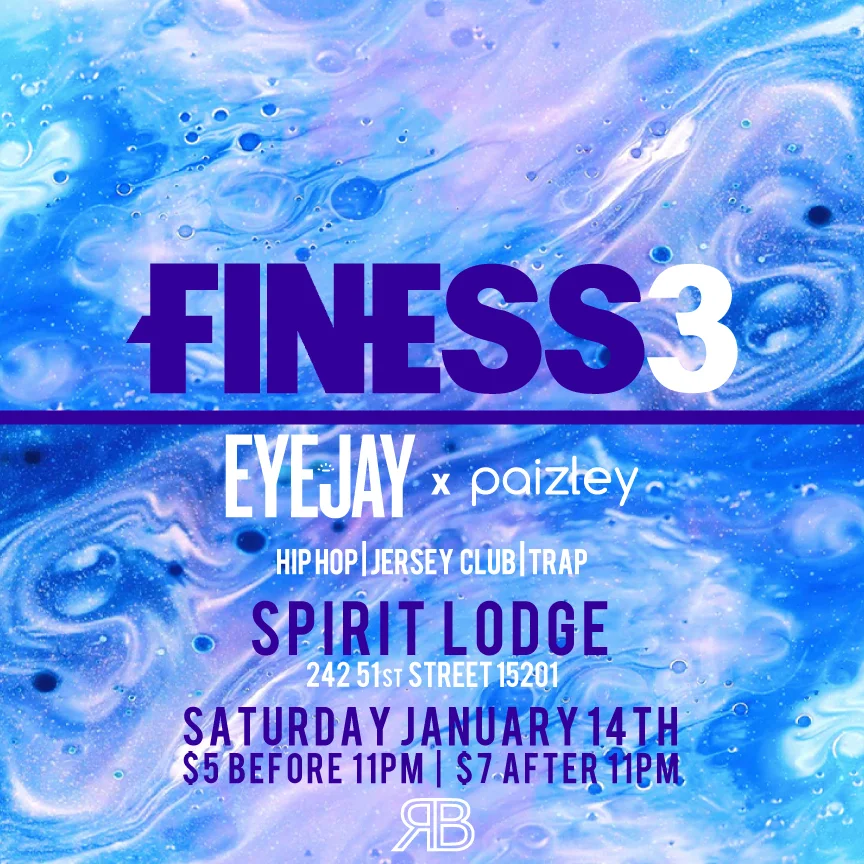 ✚ gCal ✚ iCal New Jersey’s own EYE JAY and Pittsburgh’s Paizley are BACK for the 3rd edition of FINESSE! Come party and dance to the sounds of Hip-Hop, Jersey Club & Trap!21+$5 Admission Before 11pm$7 Admission After 11pmDancing is FREE from 9-2amHosted by RB