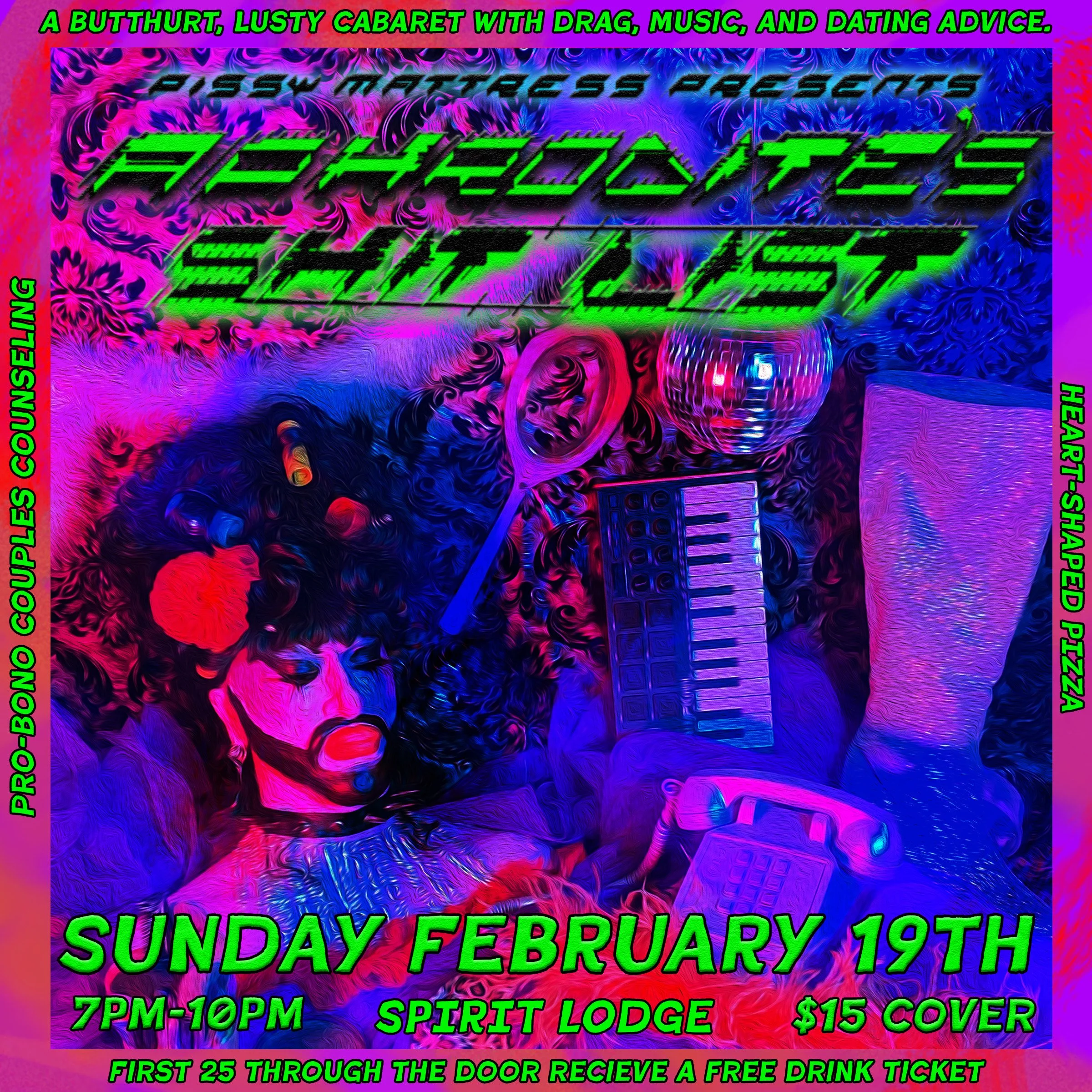 Ever the caustic romantic, Pissy Mattress presents the fifth iteration of her somewhat-annual variety show Aphrodite's Shit List at Spirit. This butt-hurt yet lusty cabaret features 7 smoldering superstars for a sexy spectacle of drag, live music, group therapy, and concupiscent wanting. Spirit slings the cocktails, mocktails, and heart-shaped pizzas all Shit List long.