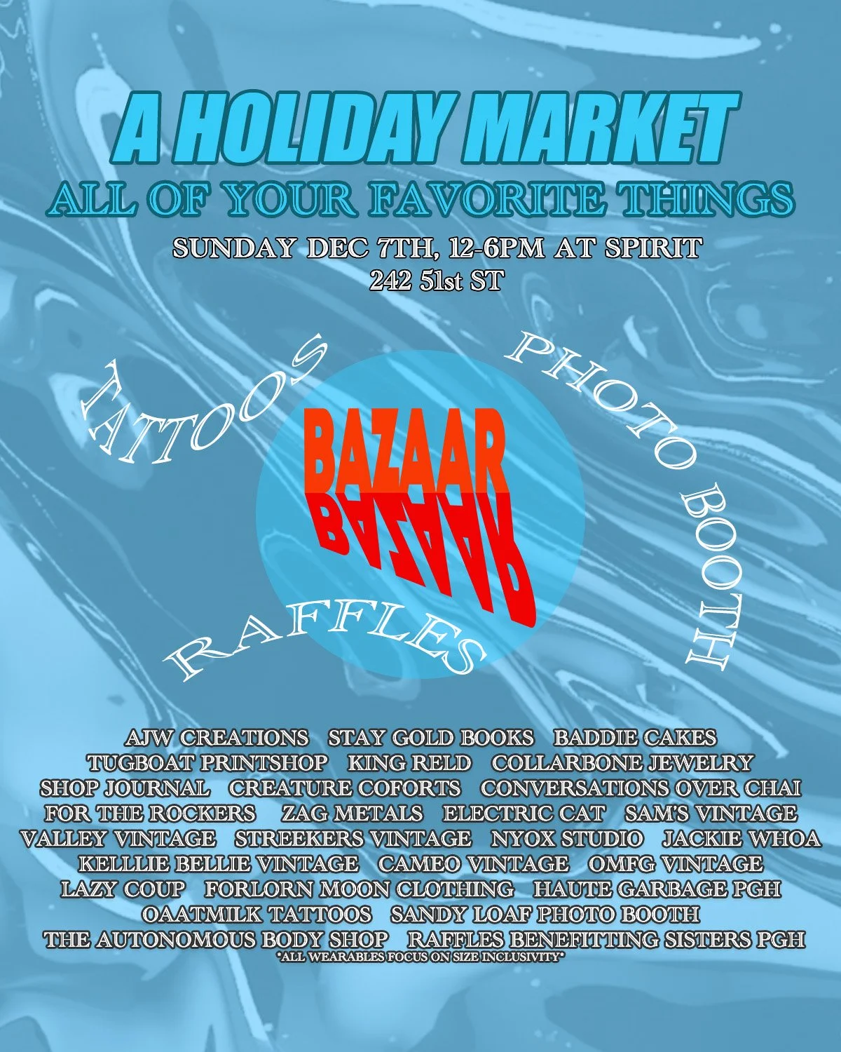 Bazaar Bazaar is a market series hosting 30+ of Pittsburgh’s finest, and new talents; featuring curated vintage, hand-crafted and upcycled goods, art, gif-tables, tattoos, an artisanal photo booth, raffles benefitting SisTers PGH and more- all of your favorite things!