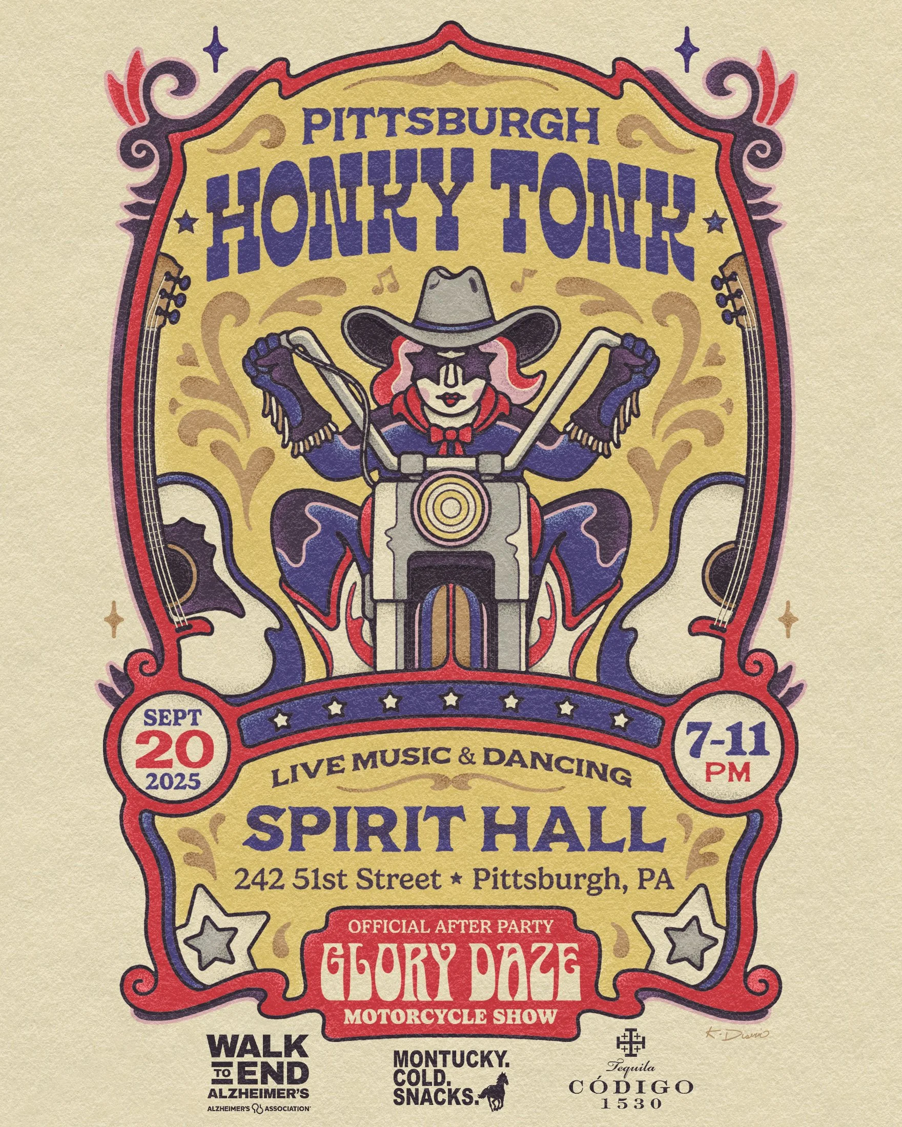 Come on down to Spirit for a night of boot-scootin' fun at The Pittsburgh Honky Tonk! Get ready to dance the night away to some good ol' country tunes. This month we will be highlighting the Alzheimer's Association and a portion of proceeds will benefit their mission to support those impacted by Alzheimer's and dementia. We are also the official After Party of GLORY DAZE Motorcycle Show. YEEHAW!