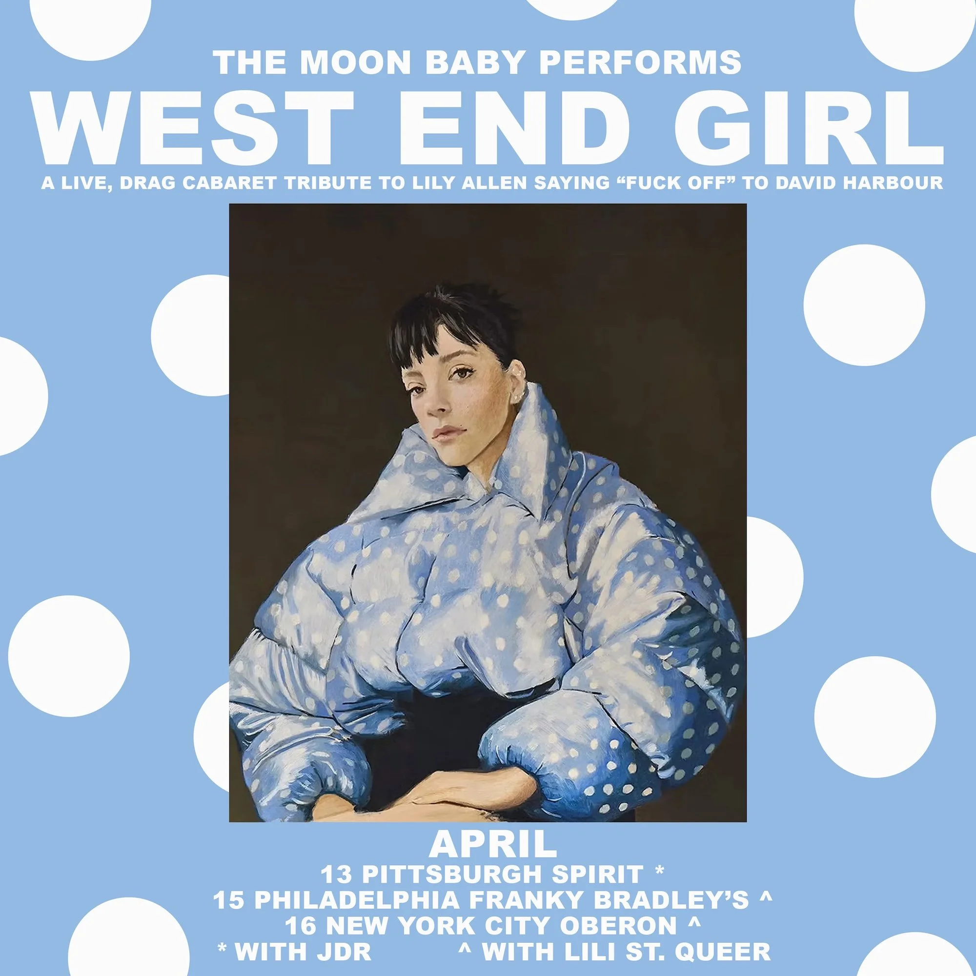 The Moon Baby and Jon David Russell return to Spirit for a live, irreverent cabaret playing Lily Allen’s masterpiece “West End Girl” in its entirety accompanied by their band, The Mignonettes.